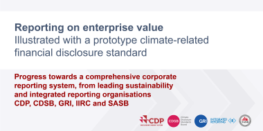 CDP, the Climate Disclosure Standards Board (CDSB), the Global Reporting Initiative (GRI), the International Integrated Reporting Council (IIRC) and the Sustainability Accounting Standards Board (SASB), have co-authored an illustration of how their current frameworks, standards and platforms, along with the elements set out by the Task Force on Climate-related Financial Disclosures (TCFD), can be used together to provide a running start for development of global standards that enable disclosure of how sustainability matters create or erode enterprise value.